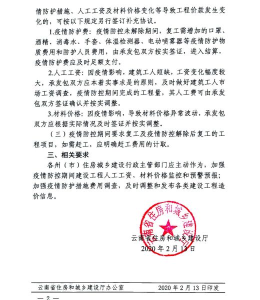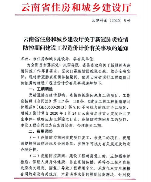 云南省住房和城鄉建設廳關于新冠肺炎疫情防控期間建設工程造價計價有關事項的通知